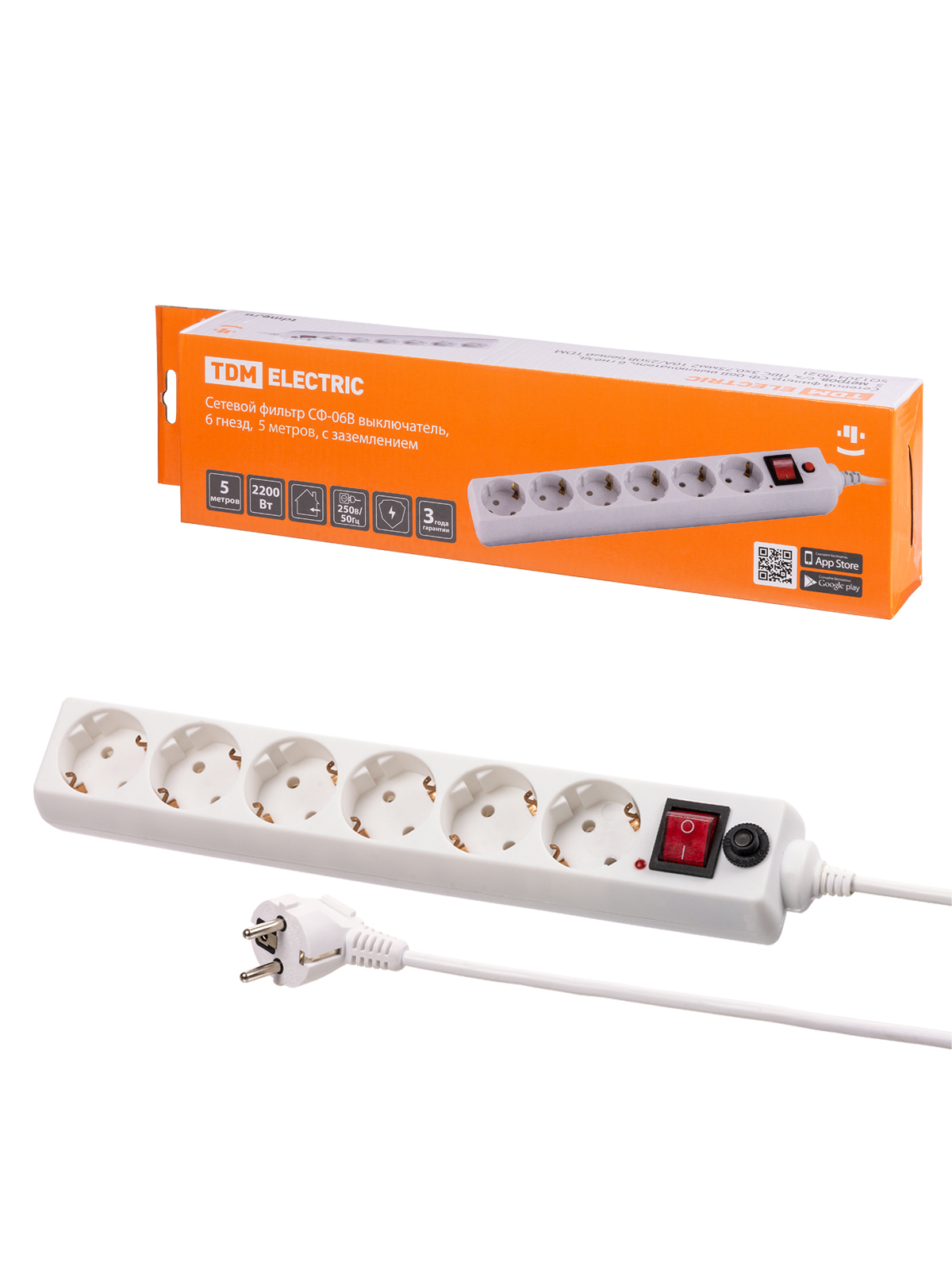 Сетевой фильтр СФ-06В выключатель, 6 гнезд, 5 метров, с/з, ПВС 3х0,75мм2 10А/250В белый TDM