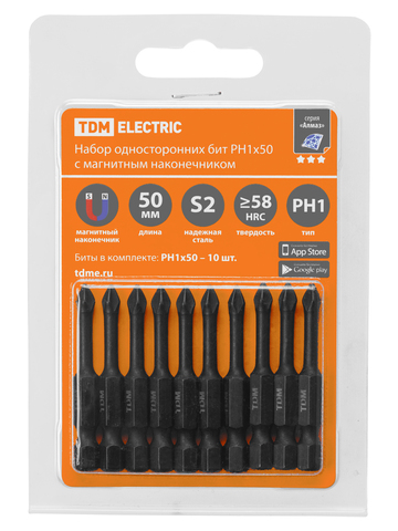 Набор бит PH1x50, односторонних, сталь S2, Е 1/4", намагниченные, торсионные, 10 шт., «Алмаз» TDM