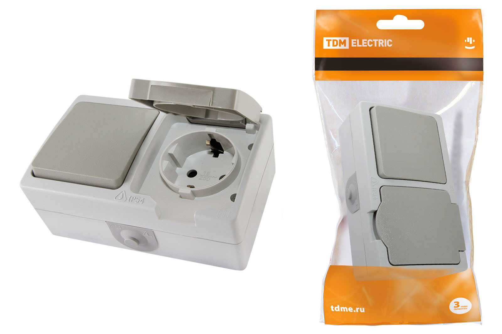 Блок комбинированный (горизонтальный) выключатель 1-кл. + розетка 2П+З с з/ш БКВР IP54 "Вуокса" TDM