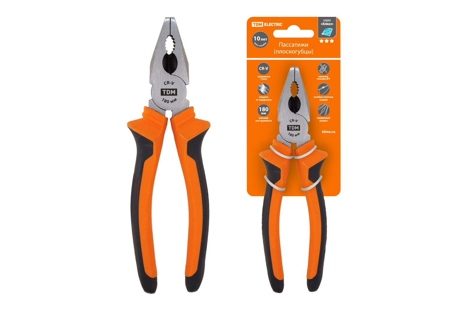 Пассатижи (плоскогубцы), с двухкомпонентными рукоятками, CR-V сталь, 180 мм, серия "Алмаз" TDM